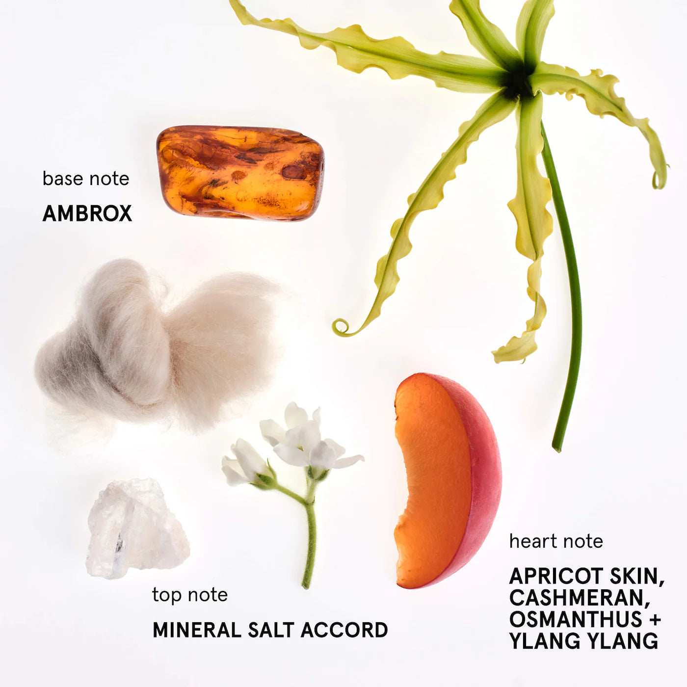 Esta fresca fragancia se abre con un acorde de sales minerales saladas, que da paso a un corazón de aterciopelada piel de albaricoque y una exquisita mezcla de nuevas flores —osmanto aterciopelado e ylang ylang cremoso—, acentuadas por la amaderada cachemira, todo ello equilibrado por una cálida base almizclada de ambrox.